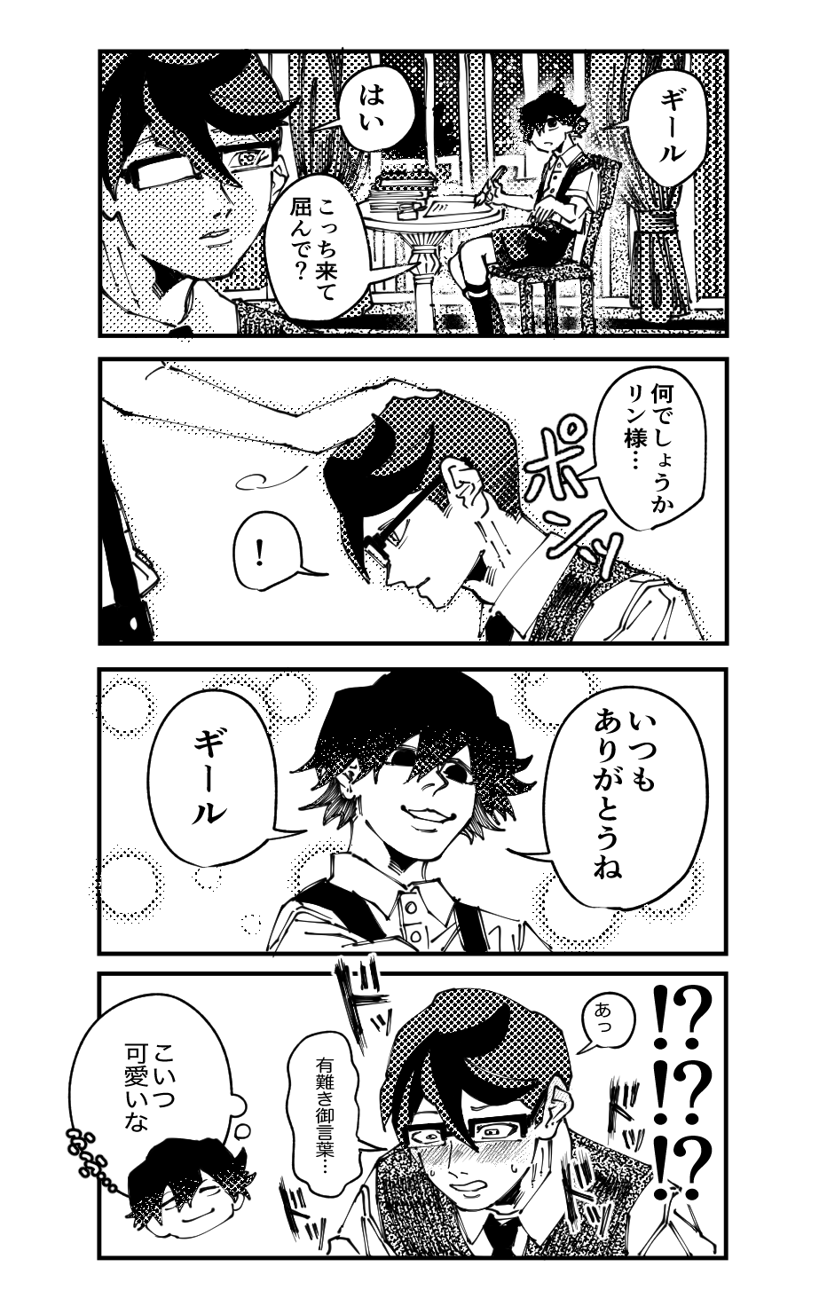 この二人の関係性は主従です。ギール(眼鏡をかけている方)は、もともと孤児院にいてリン(黒髪の少年)が幼少期のギールを拾い、自分の屋敷の清掃や自身の世話、護衛を行わせています。