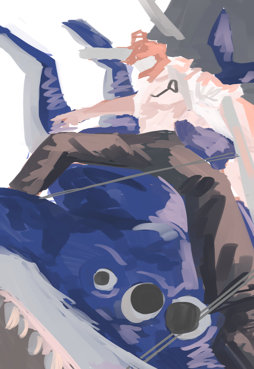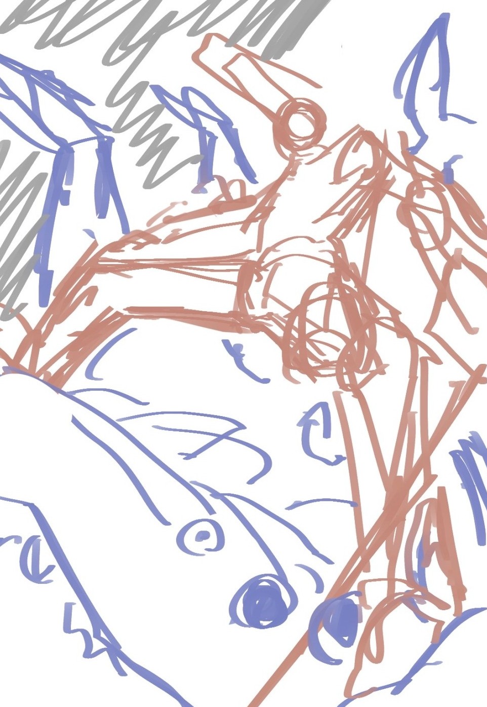 アイデアスケッチ・色ラフはかたいえのぐブラシを使用して大まかな構図を描きだしました。アオリの構図が迫力が出るだろうと考え、この構図にしました。