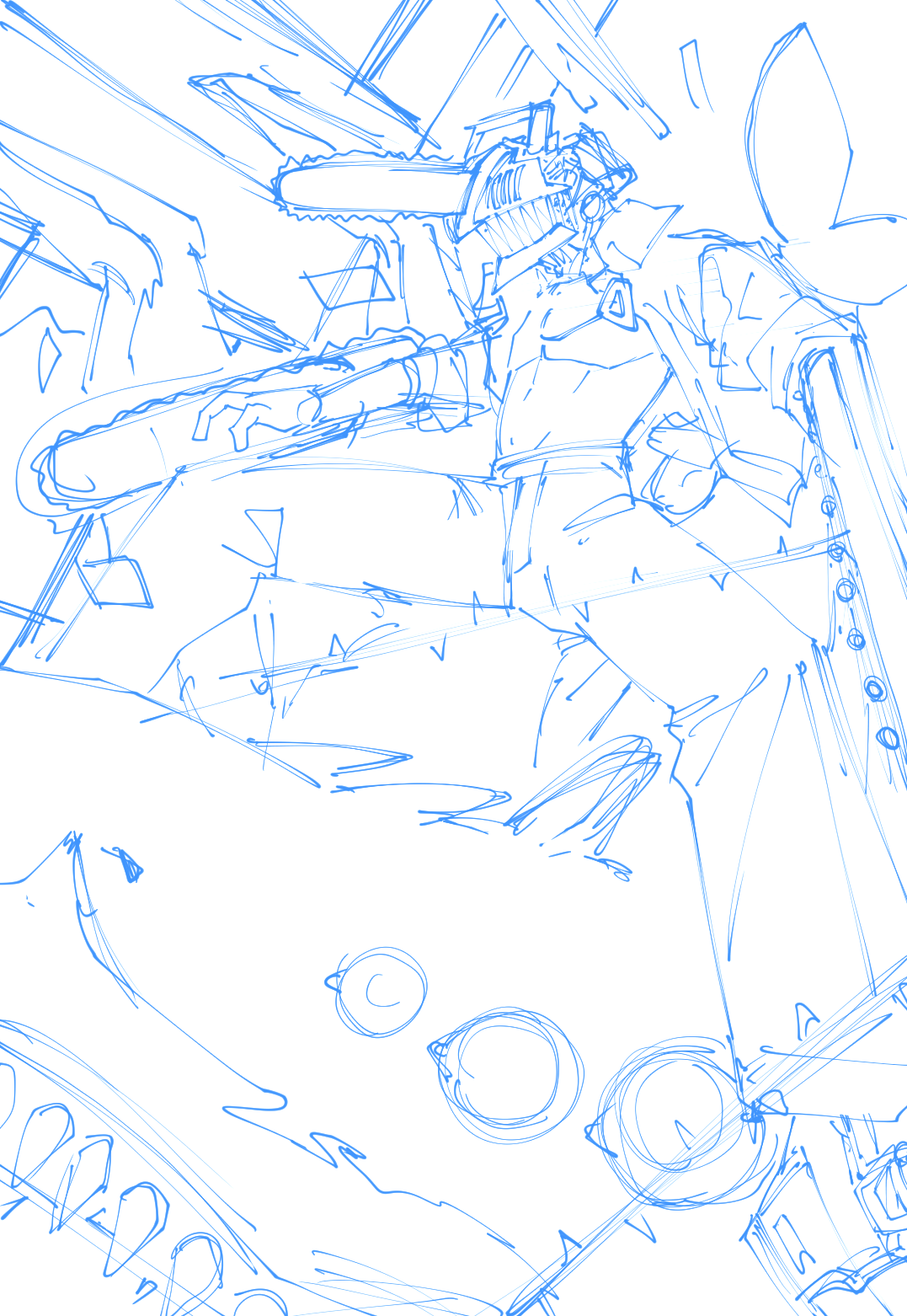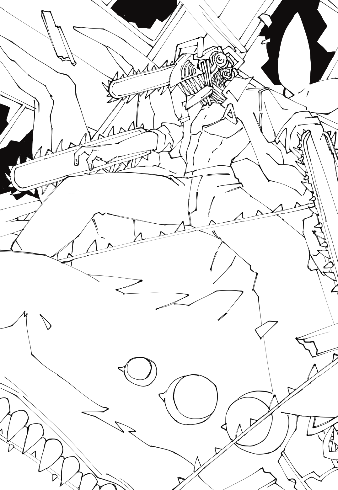 下描き・線画はGペンをカスタマイズしたものを使用して描きました。色ラフから下描きを描きだしました。このタイミングで背景の小物(窓ガラスの破片など)の配置を決定し、画面の物足りなさをなくすことを心掛けました。