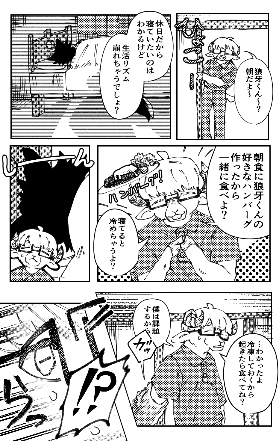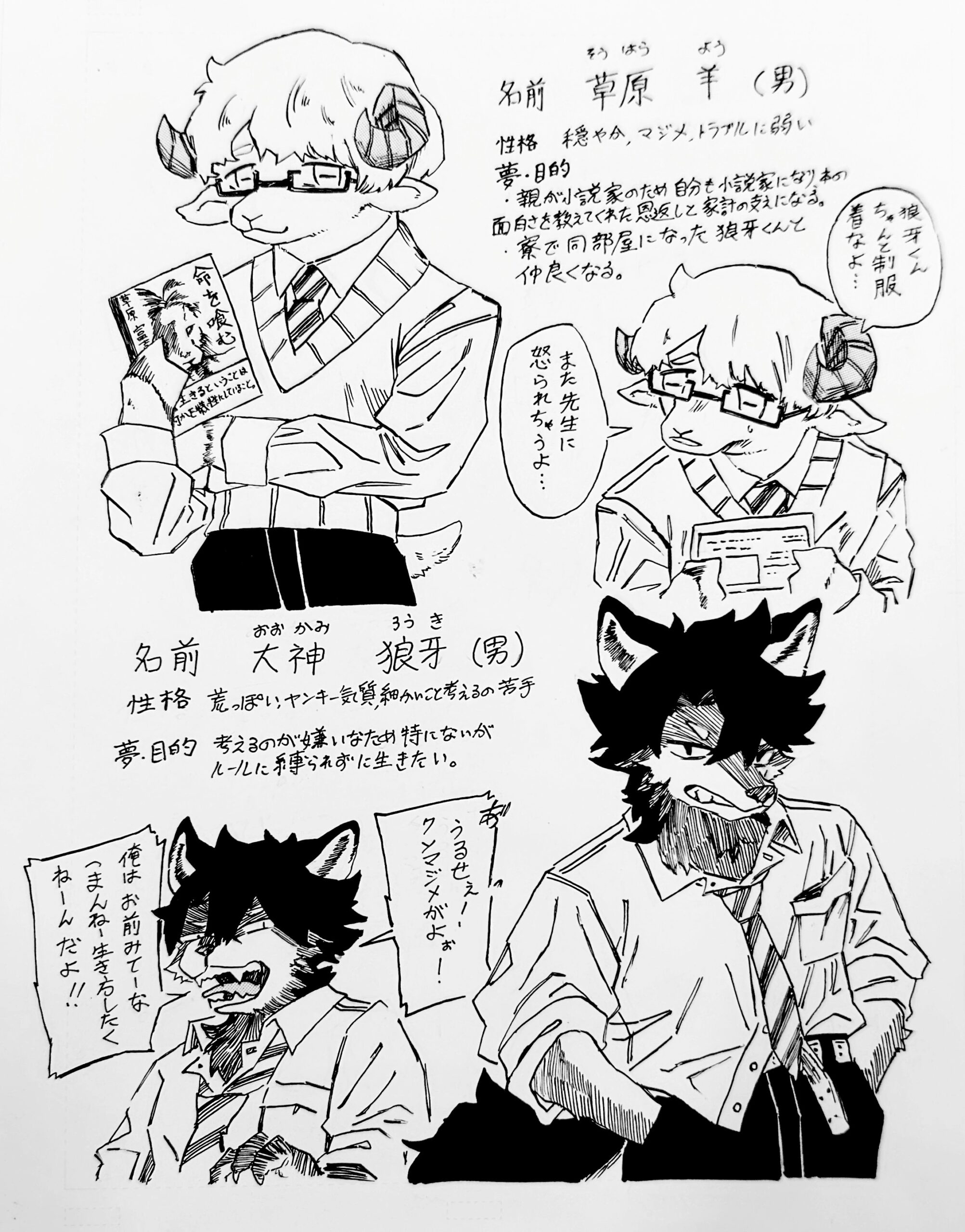 2人は同じ高校に通う学生でその学校では寮制度があり相部屋で生活をしている関係です。羊は狼牙と仲良くしたいと考えていますが狼牙はそんな羊に警戒しつつも生活を共にしていく中で互いのことを知り認識が変化していくのをもし本編を描くとしたら描きたいと考え制作しました。