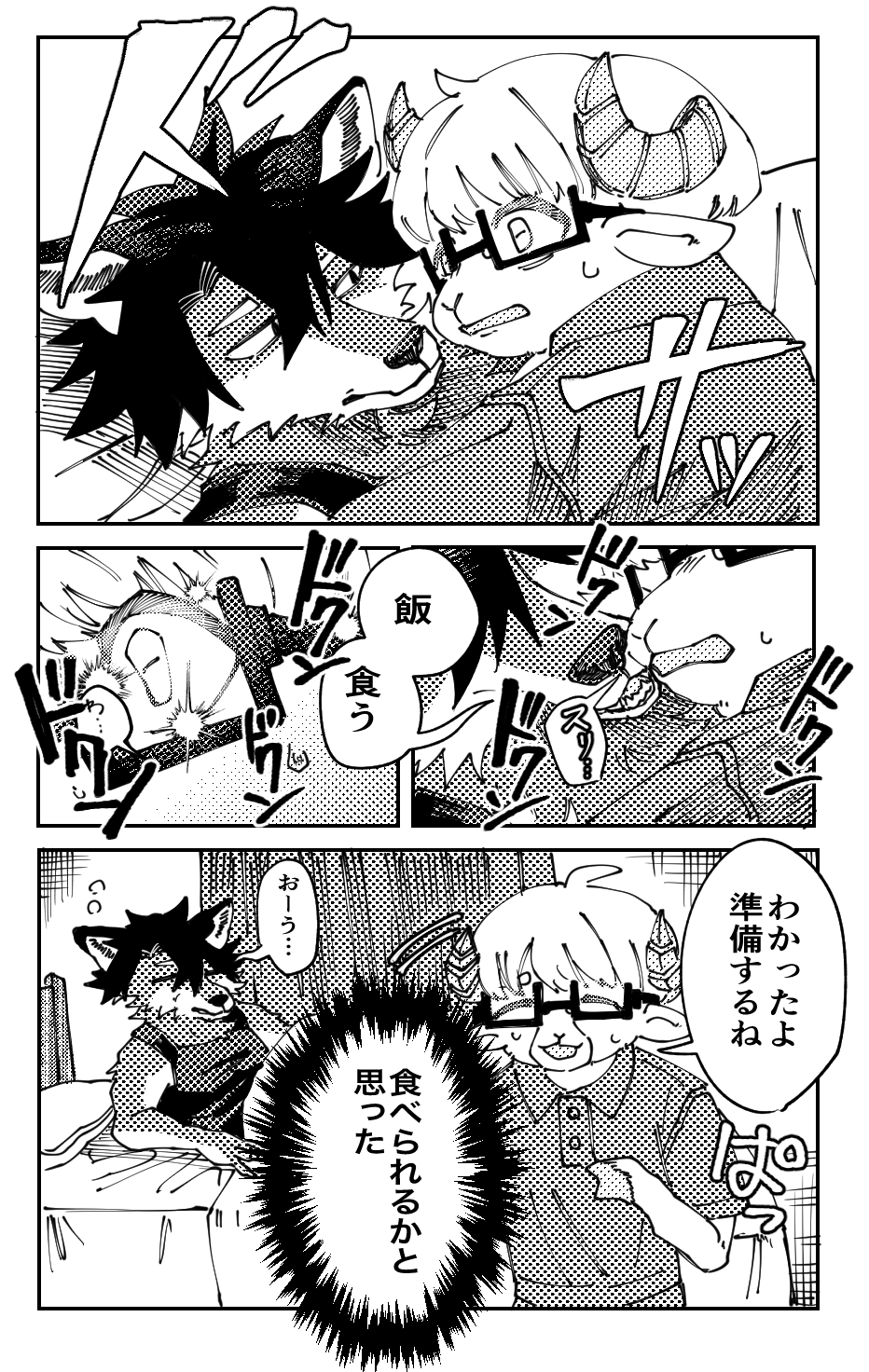この二人を描くにあたって羊や狼の生態を調べていたら「狼が相手に鼻を擦り付けるのは挨拶」というのを知り、寝ぼけた状態だったら普段はツンケンしている狼牙もするのではないかと考え制作に至りました。