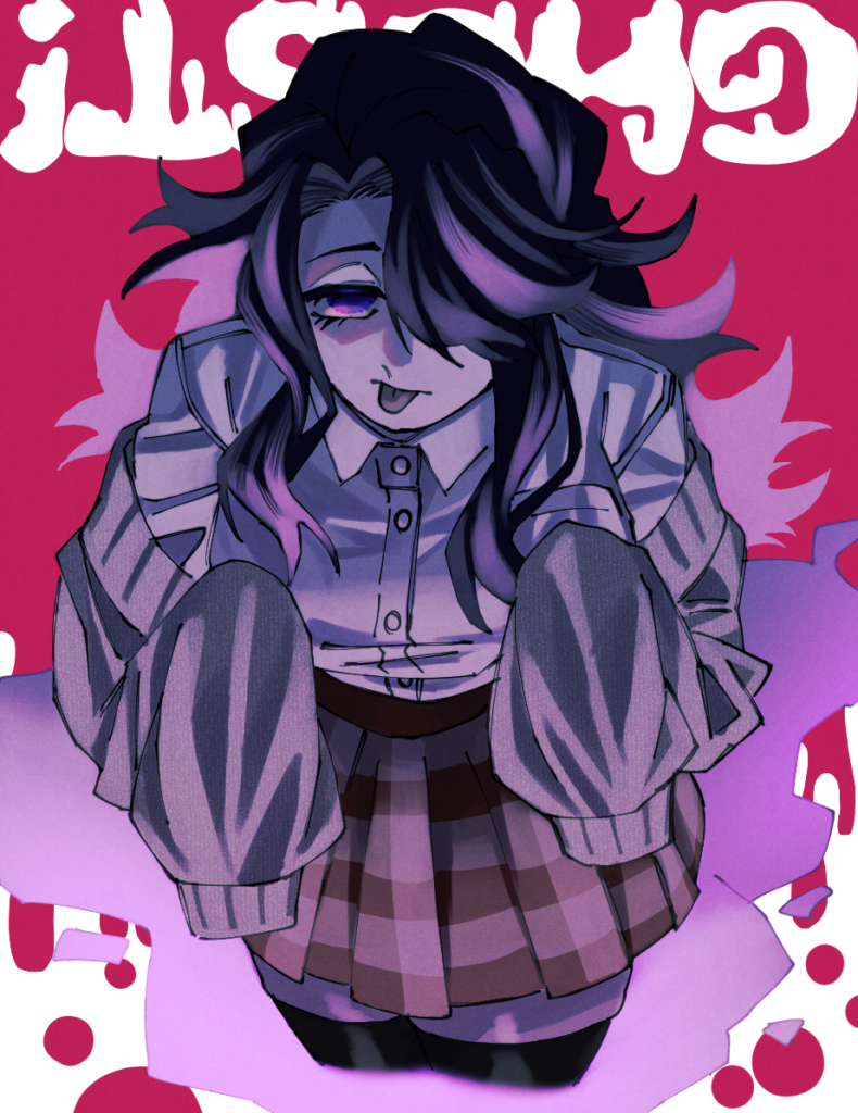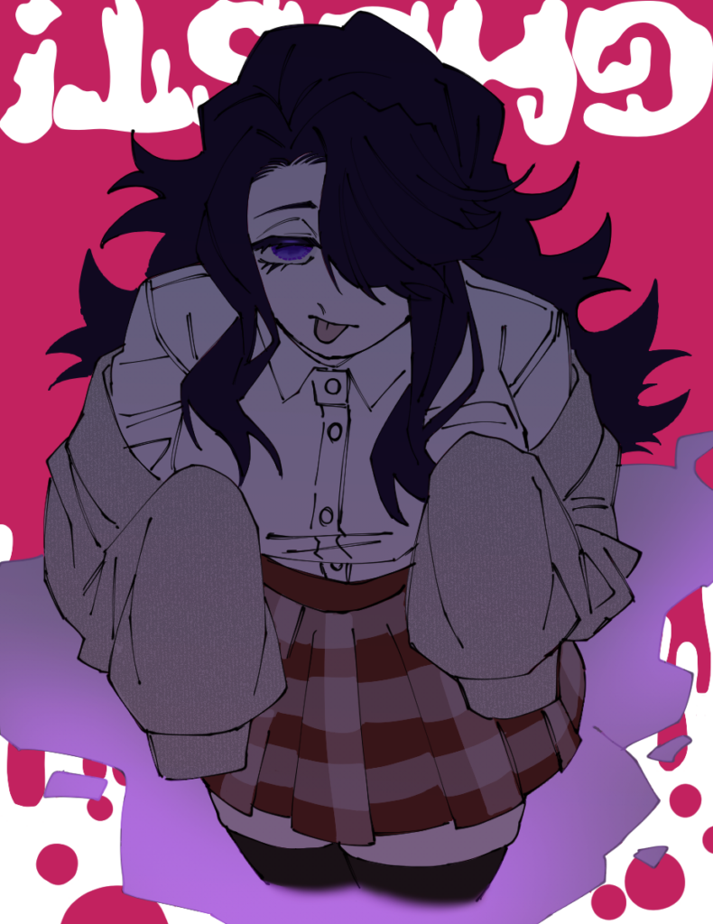 人物の描画が完成したら背景を追加します。上部にある「GHOST!」の文字は反転させて配置することで不安定感を出しました。フォントはgomhorrorというフォントを使用しています。使用したフォント以外にもフリーフォントはいろいろあるので探してみるとイラスト以外にも動画・サムネイルの制作に役立ちます。