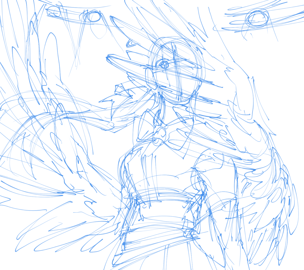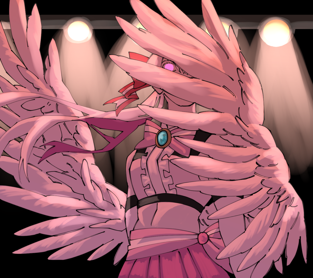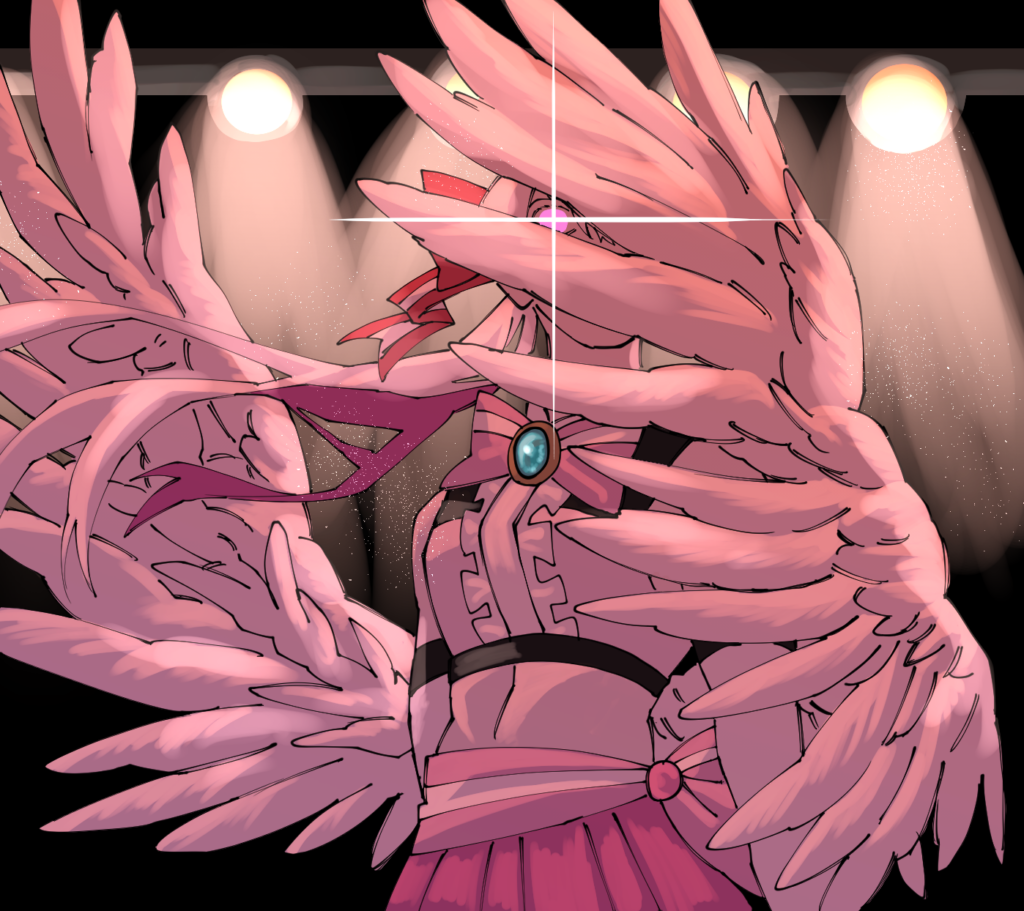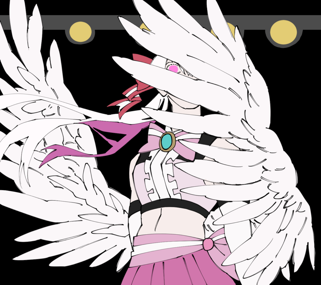 この子はアドラブル・エンターという名前です。設定としては天界で1番人気のアイドル兼配信者というものになっています。普段はすごく可愛い子なのですが「この子のかっこいいイラストを描いてみたいな」という考えが浮かんだのと、羽で顔を隠す構図があまり描いたことがなかったので構図の練習もかねての制作でした。制作時間は1時間30分です。