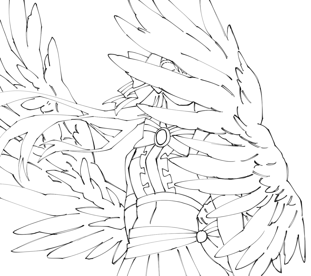 下描き・線画はGペンで描画していきました。羽は基本好きな漫画家さんの描き方やSNSで見つけた描き方を参考に制作しています。